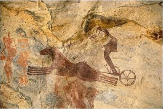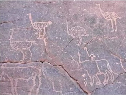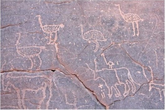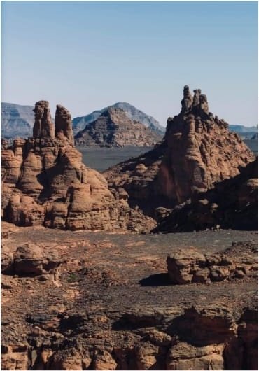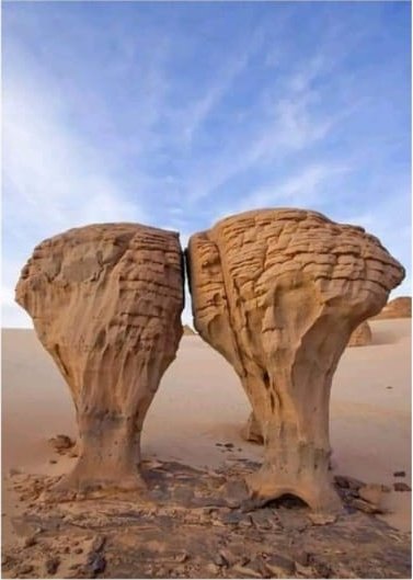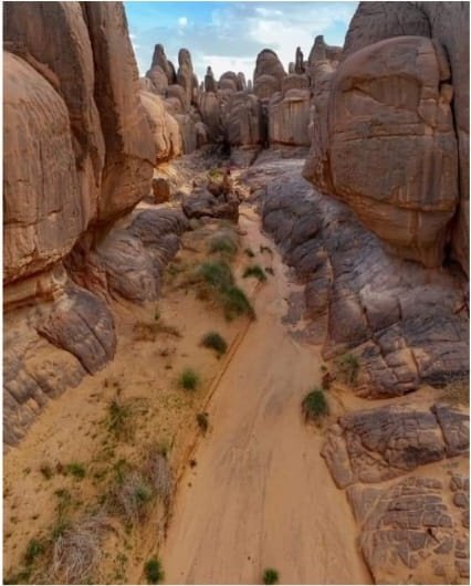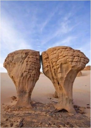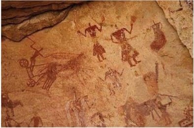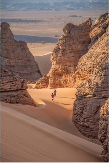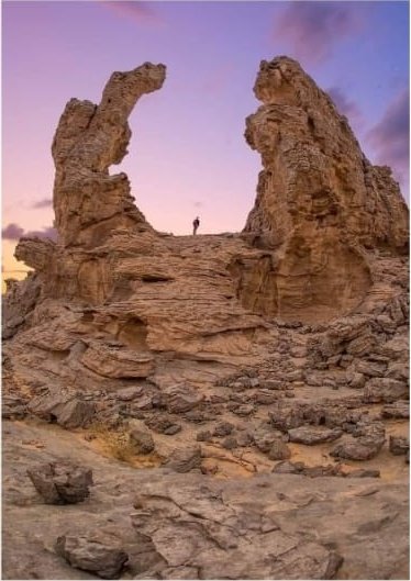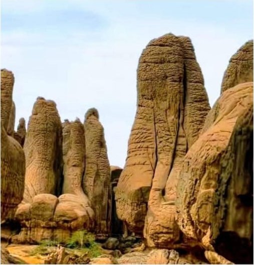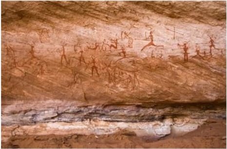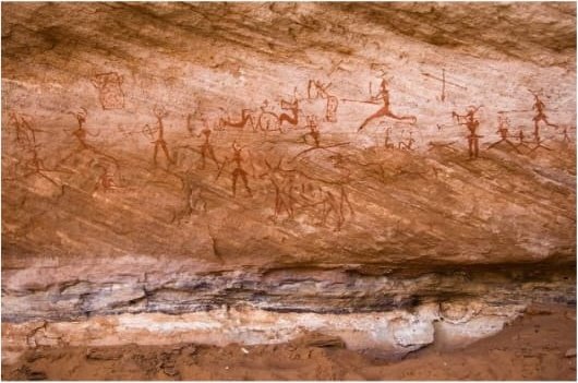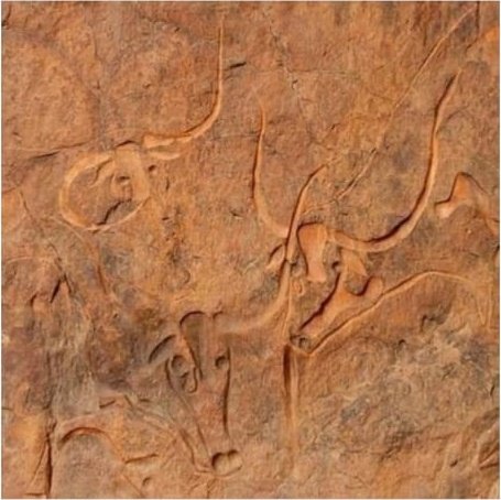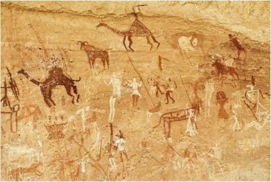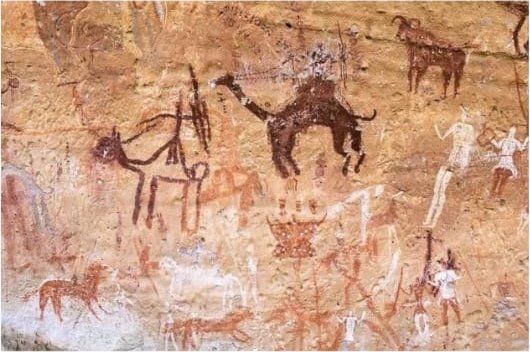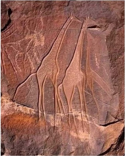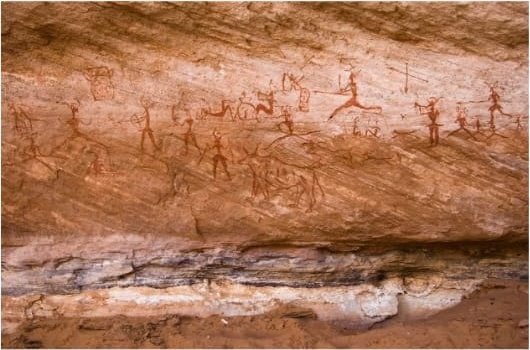 The cliffs and hollows are covered with paintings and engravings depicting people, animals (antelopes, giraffes, cattle), rituals and daily scenes. These artworks span millennia and show how the Sahara’s environment and human societies changed over time from greener landscapes with abundant wildlife to the arid desert of today.