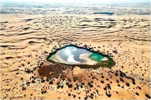 The lake sits inside a sea of orange dunes, so the bright blue or green water framed by palm trees creates a very striking contrast that few places in the world can match.